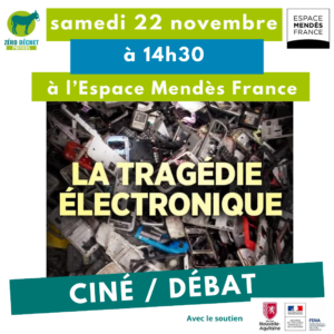 22 novembre, 14 h 30 – 16 h 30 à Espace Mendès FranceDans le cadre de la Semaine Européenne de la Réduction des Déchets, Zéro Déchet Poitiers en partenariat avec l’Espace Mendès France vous propose de venir à la projection du film “La tragédie électronique” et de participer a…