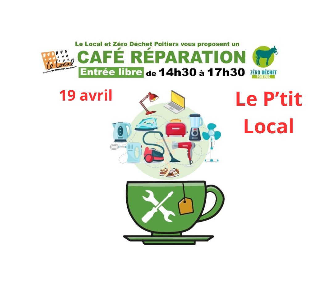 Venez avec votre objet à réparer et vous trouverez sur place outils et compétences pour vous aider à le remettre en état de marche dans une ambiance conviviale !Si vous êtes réparateur, votre profil nous intéressa aussi !Le Local en partenariat avec Grand Poitiers et l’association Zéro Déchet Poitiers. Plus d’infos et vous signaler en tant que réparateur potentiel : 06 98 40 31 86