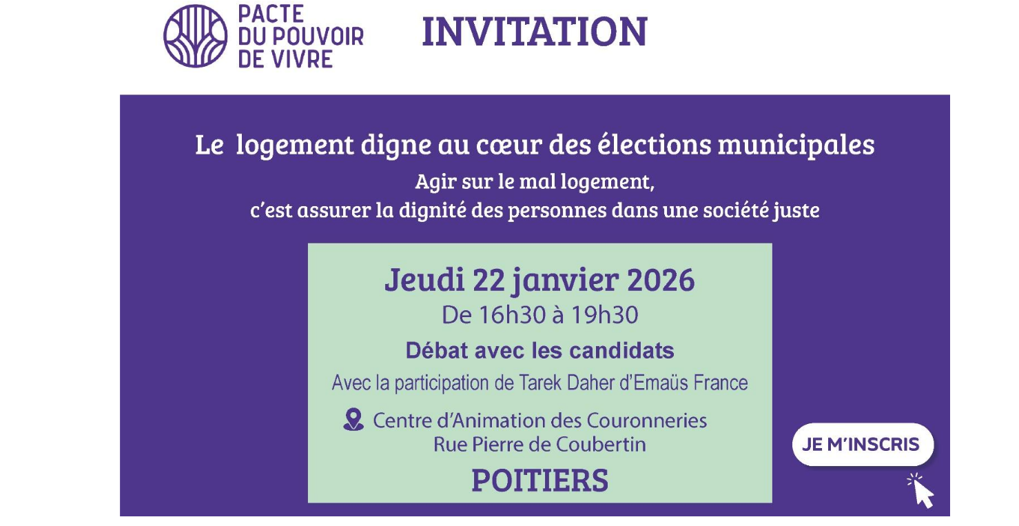 Participez à la soirée d’information et de débat avec des candidats aux élections municipales de Poitiers organisée par le Pacte du Pouvoir de Vivre.